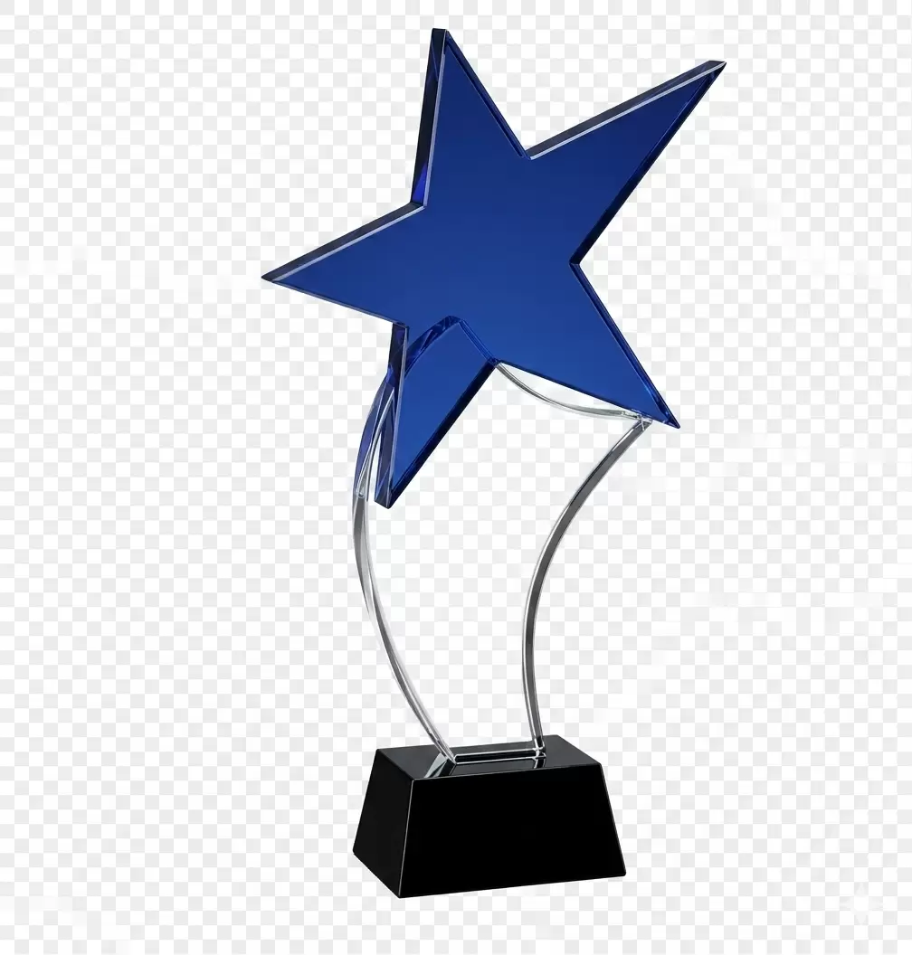 Elevate your recognition ceremonies with this striking Blue Star Glass Award. Featuring a bold, translucent blue star perched atop an elegant, curved clear glass riser, this trophy is designed to make a statement of prestige and high achievement. The award is anchored by a solid, polished black trapezoidal base, providing a sophisticated contrast that enhances its modern aesthetic. Standing at a commanding height of 27.5cm, it serves as a prominent and inspiring symbol of success for corporate leaders, top performers, and milestone achievers.