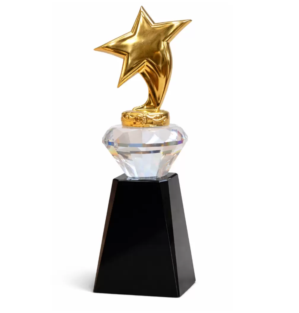 Elevate your recognition ceremony with our Luxury Gold Star Crystal Trophy, combining brilliance and sophistication. This premium design features a polished gold star mounted on a faceted crystal diamond centerpiece, resting on a sleek black base.