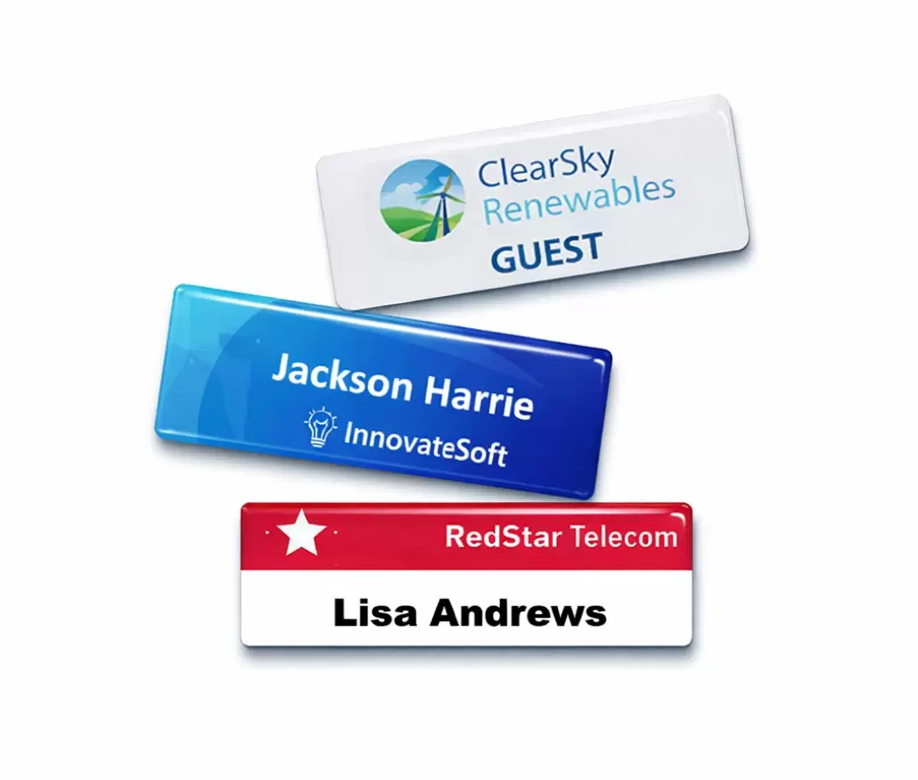 Premium name badge with a crystal-clear domed epoxy finish that enhances color depth and protects the print. Made from durable plastic or metal base, it offers a smooth glossy look, long-lasting wear, and professional appeal—ideal for corporate branding, events, retail staff, and exhibitions. Customizable with names, logos, and colors.