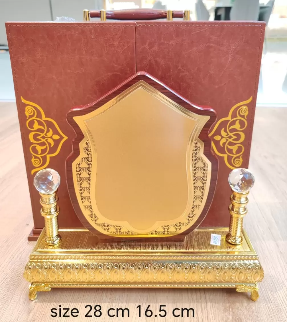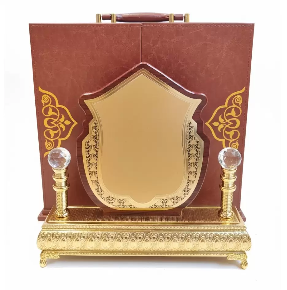 Celebrate excellence with this luxurious wooden award presented in a premium leather-finish case. Designed with elegant gold decorative patterns and a central metal plate for customization, this award is perfect for corporate recognition, government honors, VIP presentations, and special commemorative events.