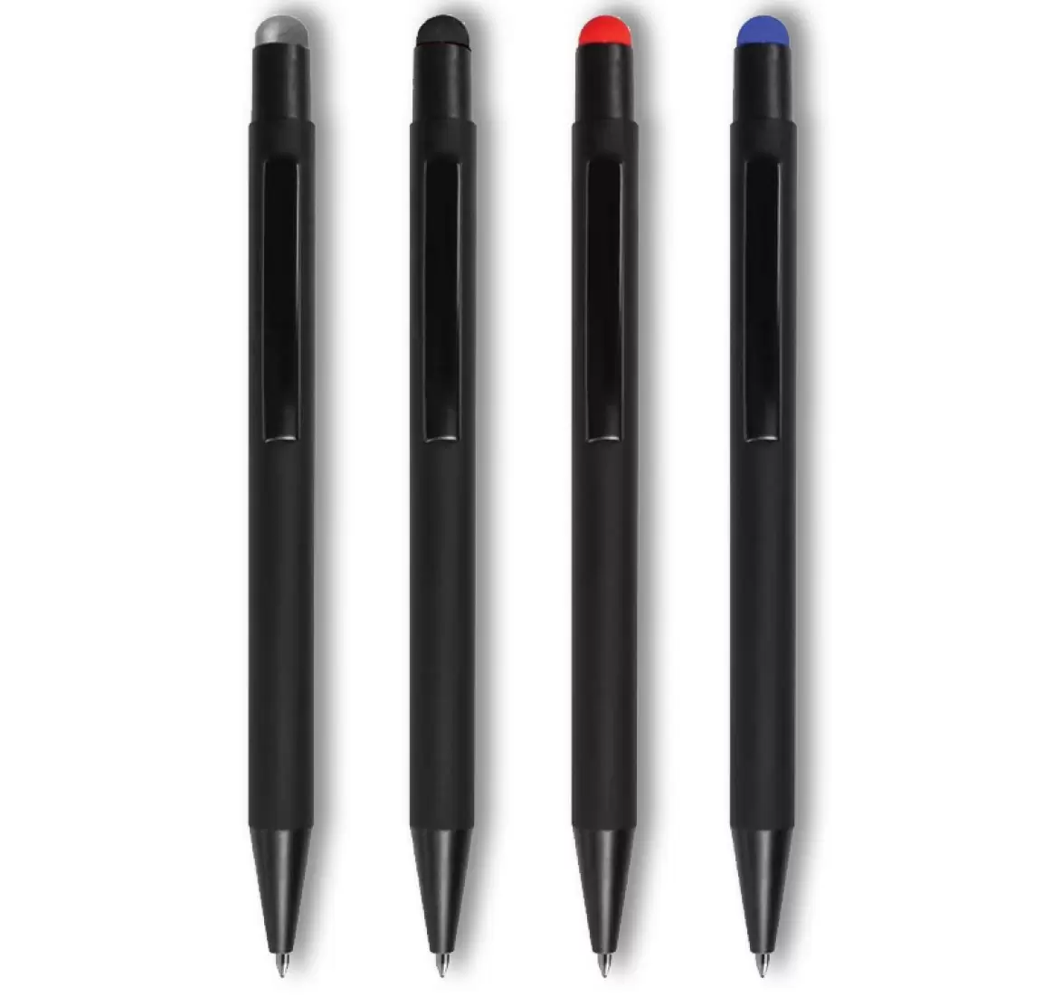 A modern dual-function ball pen with a soft stylus tip for touchscreens. Designed for smooth writing and easy device navigation, it features a slim black body with color-coded stylus tops. Ideal for offices, tech events, and promotional branding. Custom logo printing available.