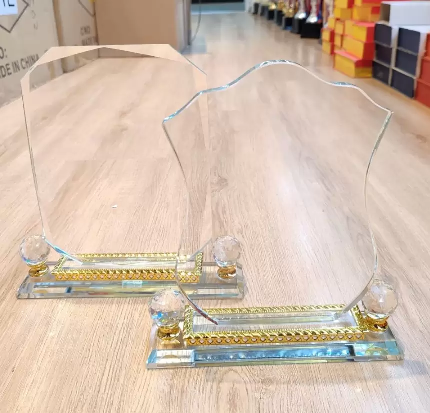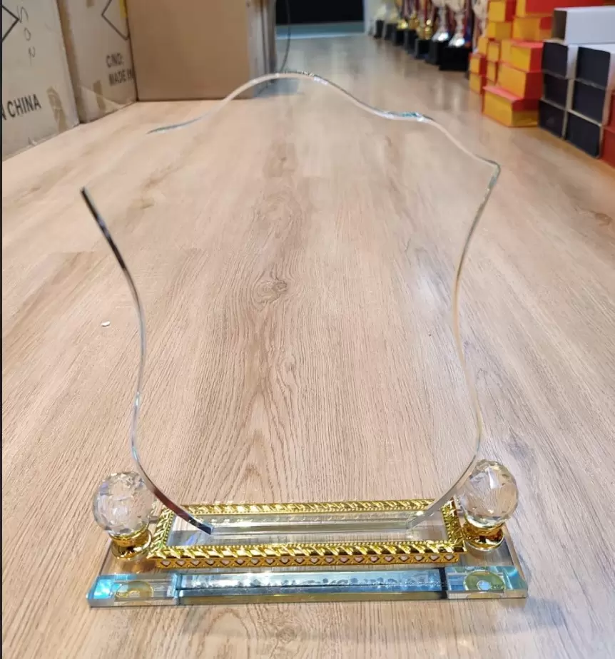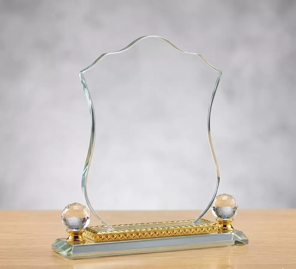 This stunning trophy features a classic shield-shaped glass plaque with elegant, scalloped edges that catch the light from every angle.
