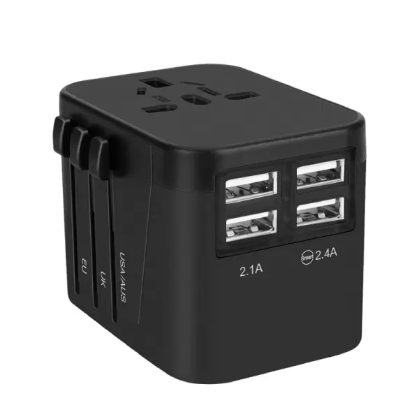 UPRADE 4 USB PORT TRAVEL ADAPTER All-in-one power adapter with surge protector, safety shutter, lock button and red power indicator light. It is convenient to carry it on your travel with small and light body, strong function. Dimension : 68x49x52mm Printing Option : UV Print, Screen Print