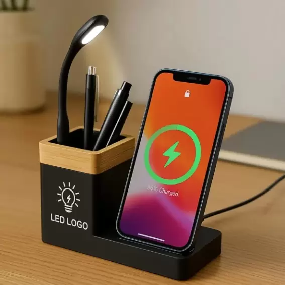 Bamboo Pen Holder with 15W Wireless Charger & LED Logo