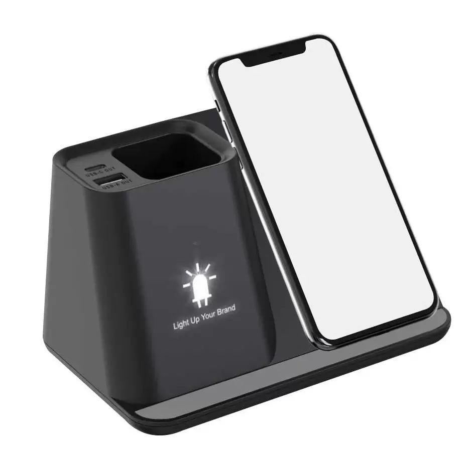 Functions: LED light for a light-up logo | a pens holder | a mobile holder | 5w wireless charger | with USB A & USB C charging ports.