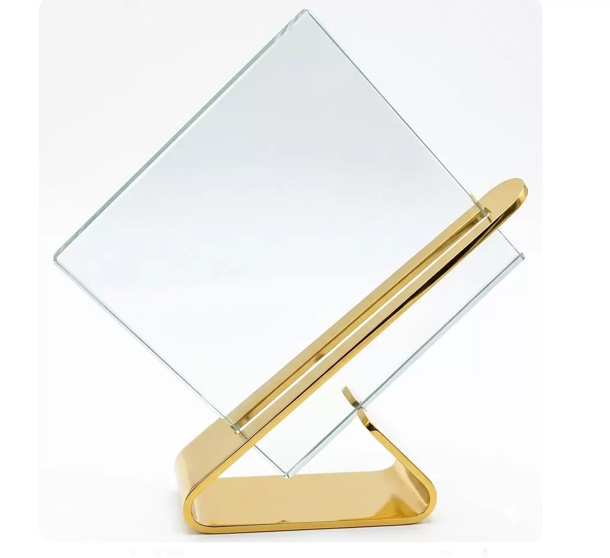 Elevate your display with modern sophistication. Add a touch of contemporary luxury to your office, event, or retail space with this striking gold and clear glass display stand. Featuring a sleek, geometric metal base with a premium gold finish, this stand cradles a crystal-clear display panel at a dynamic, eye-catching angle. Its minimalist, frameless design creates a "floating" effect, ensuring your signs, photos, or awards take center stage.