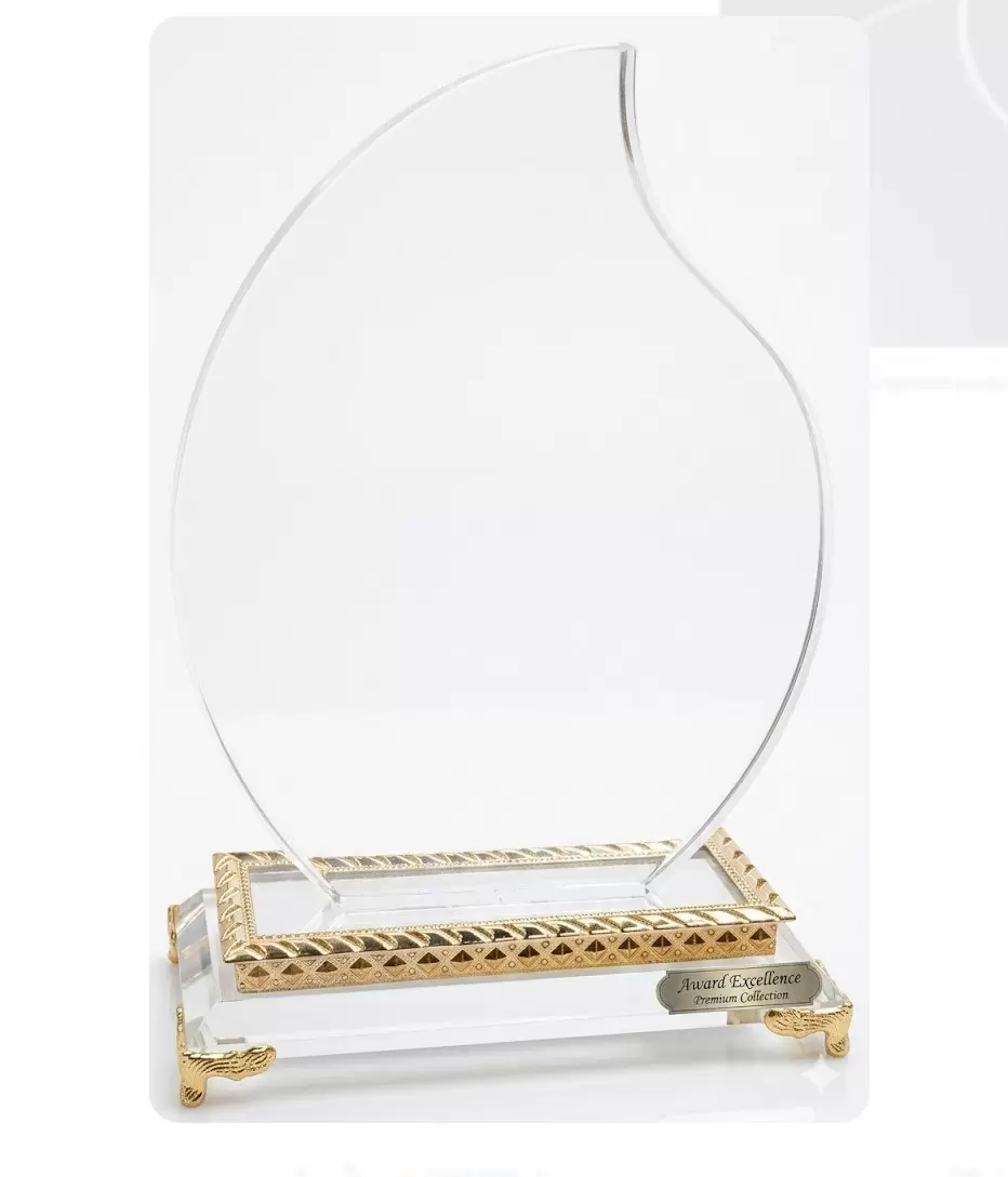 Honor outstanding achievements with this exquisite premium crystal award, featuring an elegant, flowing flame or teardrop design sculpted from high-grade optical crystal for brilliant clarity. The plaque rests on a sophisticated dual-layer base, detailed with an upper textured gold band and a solid clear crystal block. Four ornate, filigreed gold corner feet elevate the entire award, adding a touch of antique-style opulence. A side-affixed silver plaque proudly bears the text "Award Excellence Premium Collection". With ample clear space for custom sandblast etching or laser engraving, this award is the perfect way to make a lasting, prestigious statement.