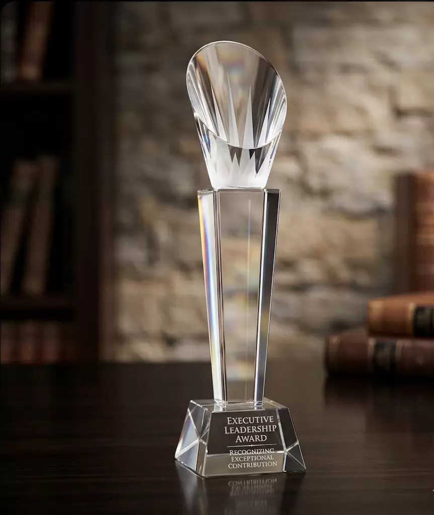 A striking symbol of visionary leadership and outstanding performance, this Ignite Executive Crystal Pillar Award is an exceptional choice for honoring remarkable achievements. Crafted from ultra-clear optical crystal, this award features a tall, hexagonal tapered column that maximizes light refraction and offers multiple facets for a stunning display of brilliance. The defining element is the large, sculpted flame finial with a hand-etched frosted texture, representing innovation, passion, and the drive for excellence.