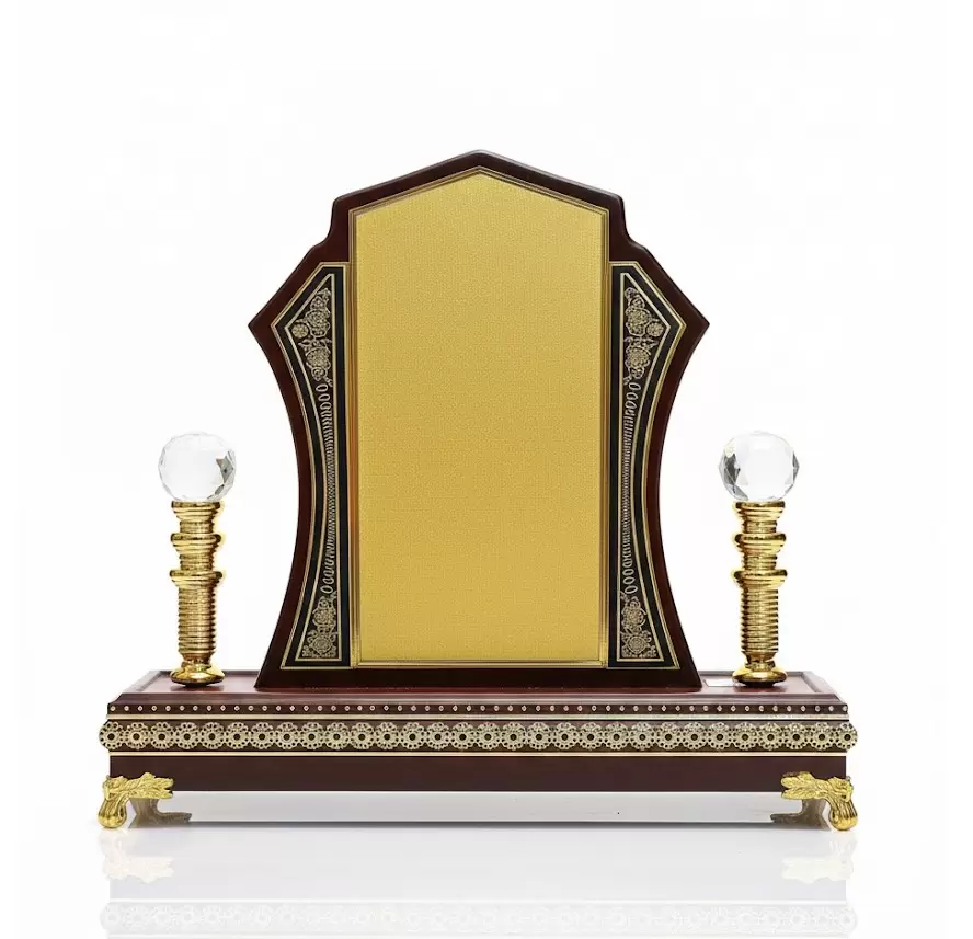 Elevate your recognition ceremonies with this masterfully crafted trophy. Featuring a blend of traditional elegance and modern printing technology, this award is designed to stand out in any corporate or governmental setting. Its intricate gold-patterned borders and rich wood-tone accents provide a timeless aesthetic that honors the recipient's achievements with prestige.