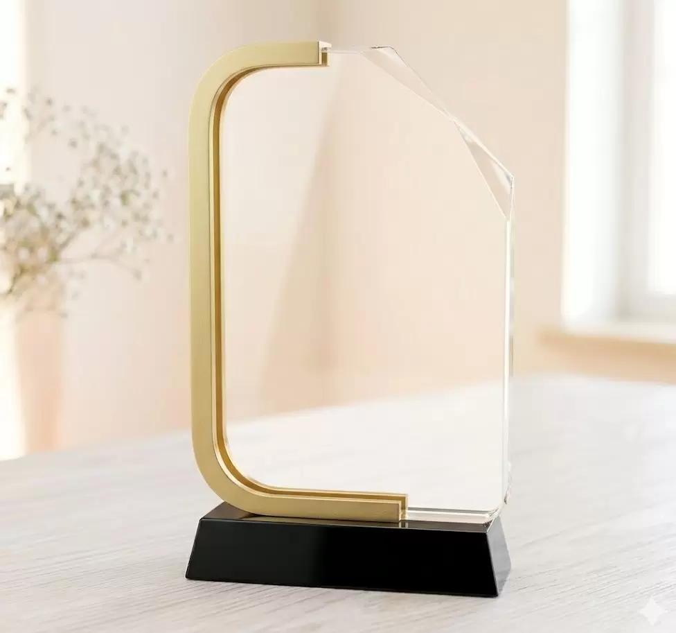 For a contemporary and sleek look, this award features a unique asymmetrical geometric glass plate held by a bold, wraparound frame.